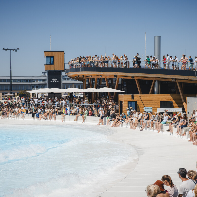 Die Freizeitanlage ist viel mehr als nur ein Wavepool für Surfer*innen: Ein Strandbereich mit großzügigen Liegeflächen, diverse Eventflächen und das moderne Gastronomie-Konzept sorgen für eine hohe Aufenthaltsqualität.