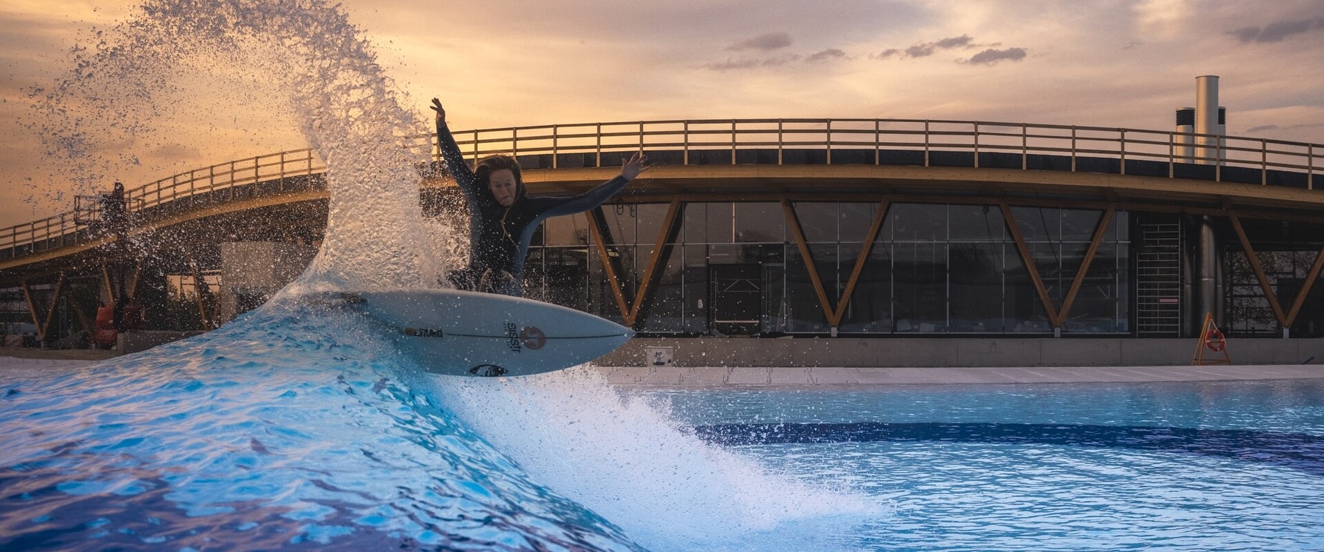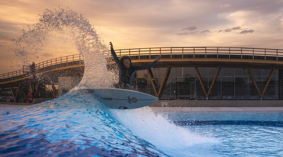 Bevor die Anlage im Sommer offiziell eröffnet, konnten Pressevertreter:innen einen exklusiven ersten Blick auf den Wavepool werfen und seine Premiere bei einer Test-Vorführung miterleben. Die Wellen werden durch die einzigartige Endless-Surf-Wellentechnologie erzeugt, die auf Luftdruck basiert. Der Surfpark befindet sich noch in der Fertigstellung, weshalb ein genaues Eröffnungsdatum noch nicht steht.