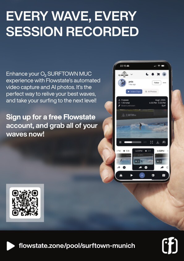 Simply head to flowstate.zone and choose “Surftown” in the top left corner. Or head straight to flowstate.zone/pool/surftown-munich and you’ll land straight into the Surftown Zone where you can see all the activity happening in the pool. From there hit “Get My Clips”. If you’re not logged in you’ll see a message to login or sign up - make sure you sign up on Flowstate using the same email address you use for your Surftown bookings. Once you’ve signed up, or logged in, all your sessions will be listed and you can easily jump straight into your sessions to find yourself and purchase your surf videos.